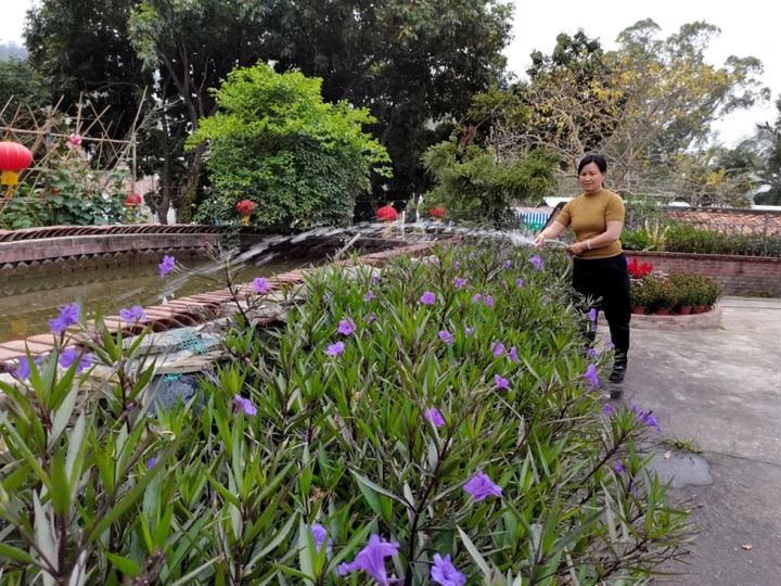 惠城區江南街道七聯村村民紀金秋在自家小院澆花。