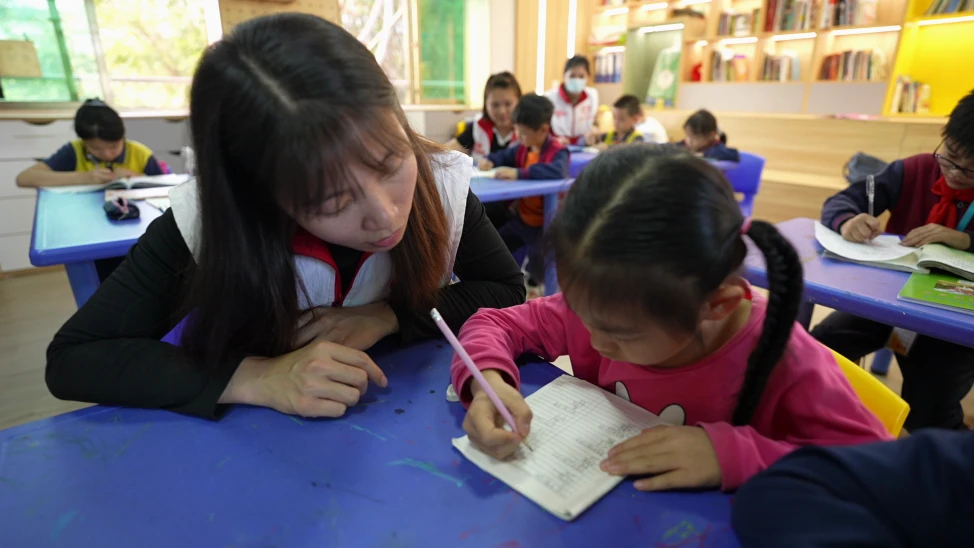 下午5時許,放學的孩子們紛紛走進村頭村兒童服務站,自覺地拿出書本,安靜地做起了作業。遇到不懂的問題,他們舉起小手,一旁的志愿者老師就上前為他們輔導。