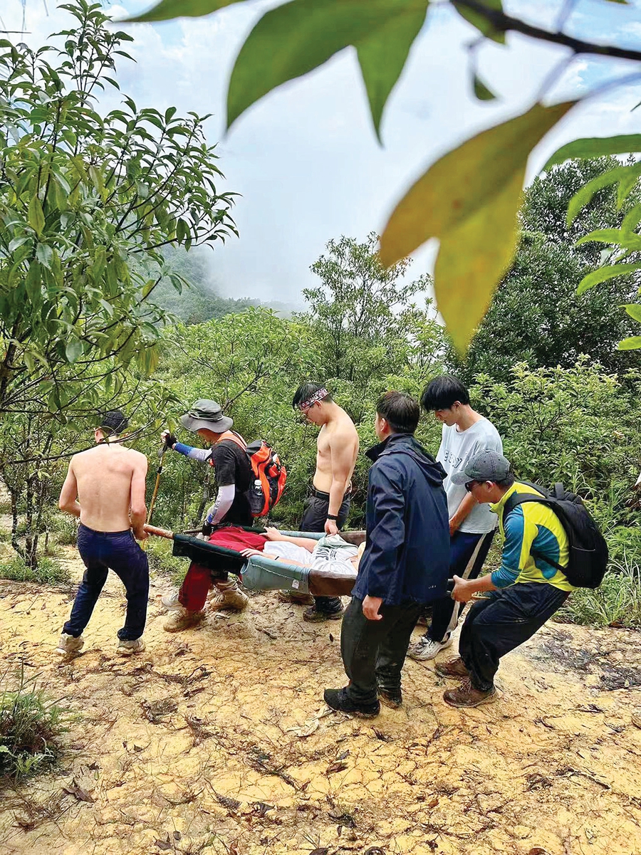 上山容易下山難,加之雨后陡峭的山路格外濕滑,徒手下山都容易摔跤,更何況抬著一個人。為了確保不讓擔架上的女孩摔出來,胡朝俊和同伴楊偉聰、呂開亮、鄭永金、鄭錦昌、戴云光等人抬著擔架兩側的前中后,盡可能快地抬著下山。一路上,女孩有時突然驚起,同行的人連忙安慰:“你放心,別怕,我們會抬你下山的!”看到女孩似乎要昏睡過去,拼友們又輕輕拍醒她,不讓她睡過去。