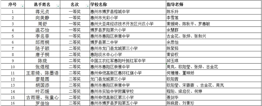 經過激烈角逐,蔣元貞、向美靜、周舒、溫芯怡、李名菲5名選手獲一等獎,邱雨桐、陸子穎、唐子桐等選手獲二等獎,曹志恒、蘇莉娟、楊易程等選手獲三等獎。此次活動還對“優秀組織單位”“優秀指導老師”進行評選并頒發證書。