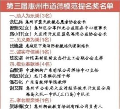 為深入貫徹落實習近平新時代中國特色社會主義思想,大力培育和踐行社會主義核心價值觀,充分發揮道德模范榜樣示范作用,弘揚中華傳統美德,培育時代新風新貌,不斷提高人民思想覺悟、道德水準、文明素養,爭做崇高道德的踐行者、文明風尚的維護者、美好生活的創造者,形成崇德向善、見賢思齊、德行天下的濃厚社會氛圍,經組織推薦、遴選審核、媒體公示、評委會評審通過,鄧文進等10名同志獲評第三屆惠州市道德模范榮譽稱號,余紅兵等10名同志獲評第三屆惠州市道德模范提名獎。