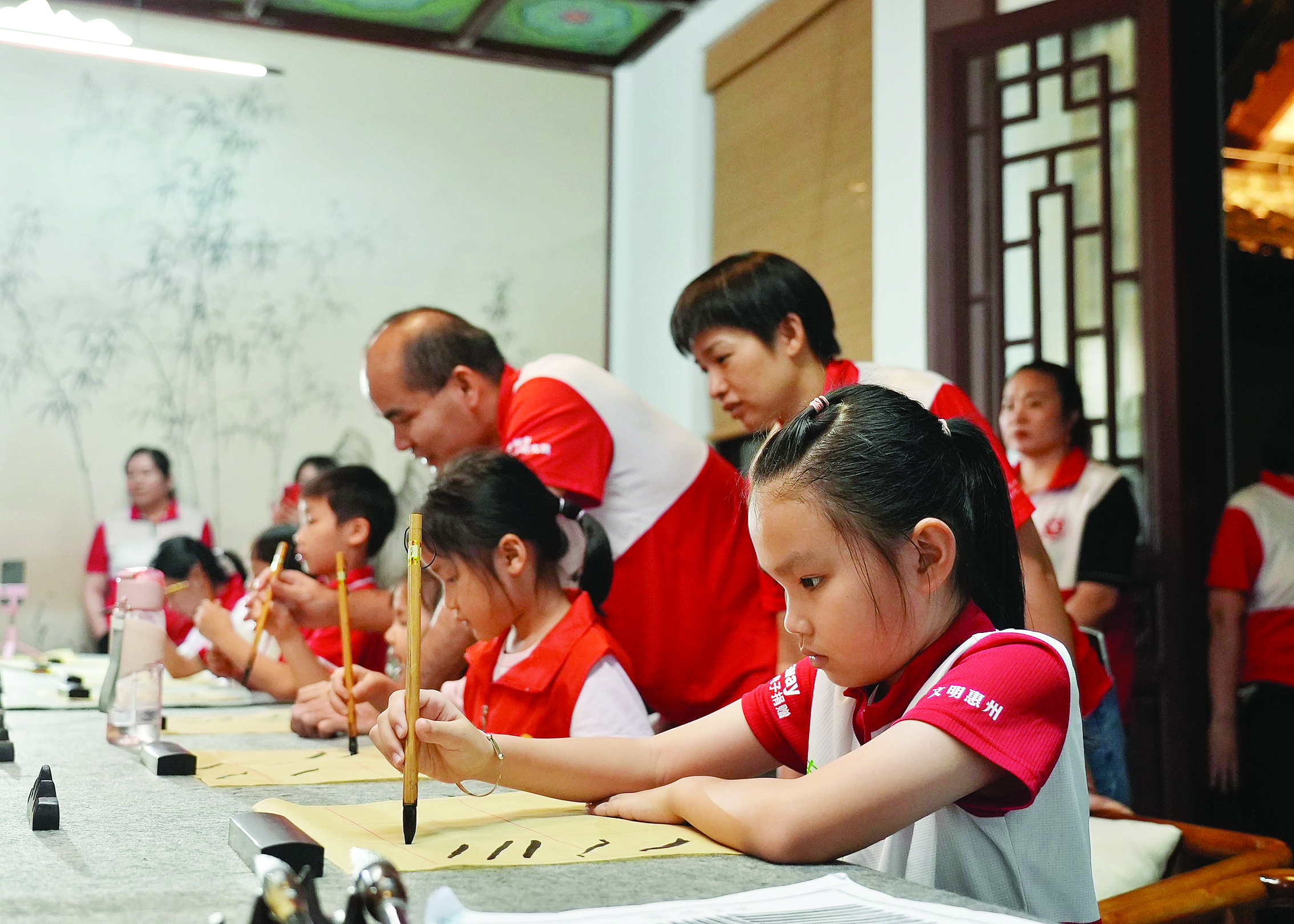 惠州日報訊 (記者譚琳)“握筆時一定要記住指實、拳虛、腕平。”8月23日晚上,志愿者、惠州書法家協會會員夏華獎給孩子們示范握筆姿勢,講解書法要點。