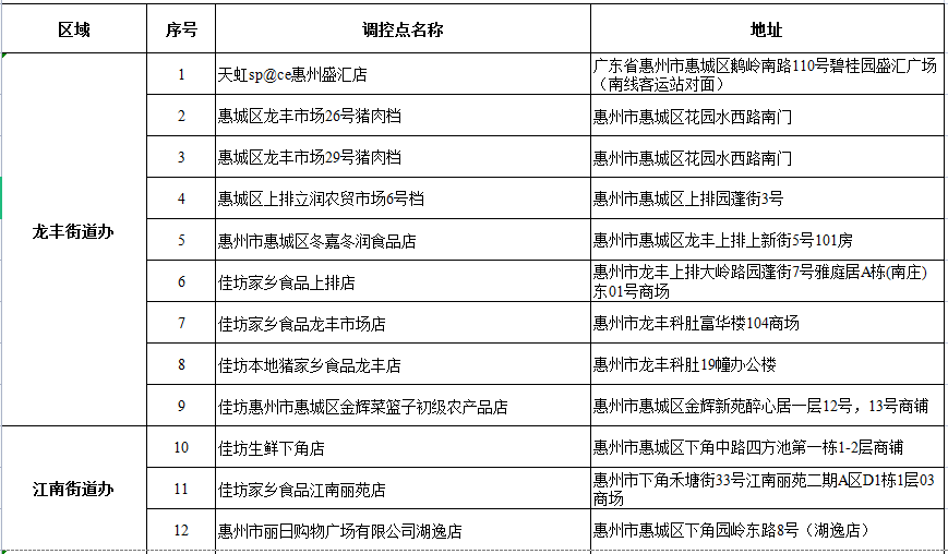 據介紹,50個調控點分別由市肉聯廠有限公司、佳坊農產品有限公司、麗日購物廣場、天虹商場、匯綠鮮果蔬農民專業合作社等企業承擔政府調控豬肉具體銷售工作。屆時,各調控點將會在適當位置懸掛“2023年春節期間政府價格惠民豬肉調控點”橫幅以及張貼“政府價格惠民豬肉調控價目表”。