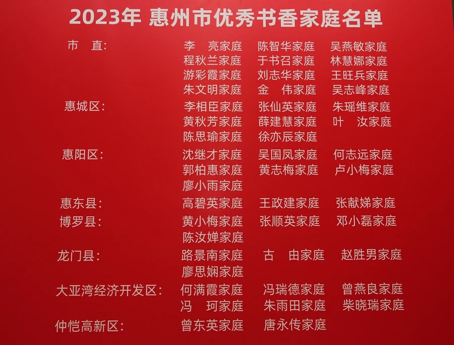 惠州日報訊 (記者馬海菊)2023南國書香節(jié)暨第十三屆惠州書展活動之“書香潤成長,‘閱’見幸福家”2023年惠州市“優(yōu)秀書香家庭”揭曉活動8月18日舉行,46戶家庭被選樹為2023年惠州市“優(yōu)秀書香家庭”。