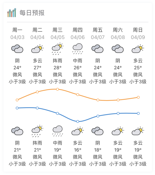 4日,陰天,早晚有輕霧,22~26℃;5日,陰天,有雷陣雨局部大雨,23~26℃;6日,中到大雨局部暴雨,20~23℃;7日,分散陣雨轉陰天,18~22℃;8日,陰天到多云,19~24℃。