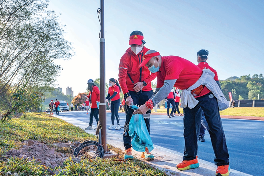 志愿者們在激流坑水庫桃花源休閑運動生態公園撿跑。惠州東江圖片社供圖