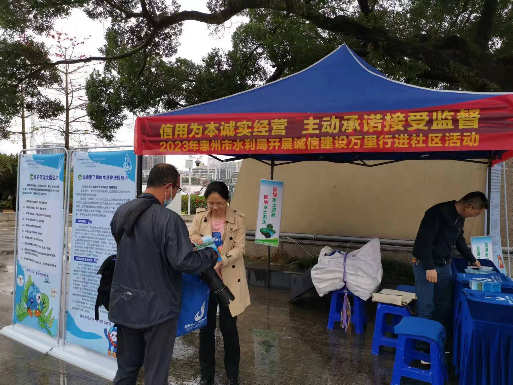 3月26日,惠州市水利局在惠州市惠城區江北東江公園廣場以“信用為本誠信經營 主動承諾接受監督”主題,開展誠信建設萬里行進社區宣傳。