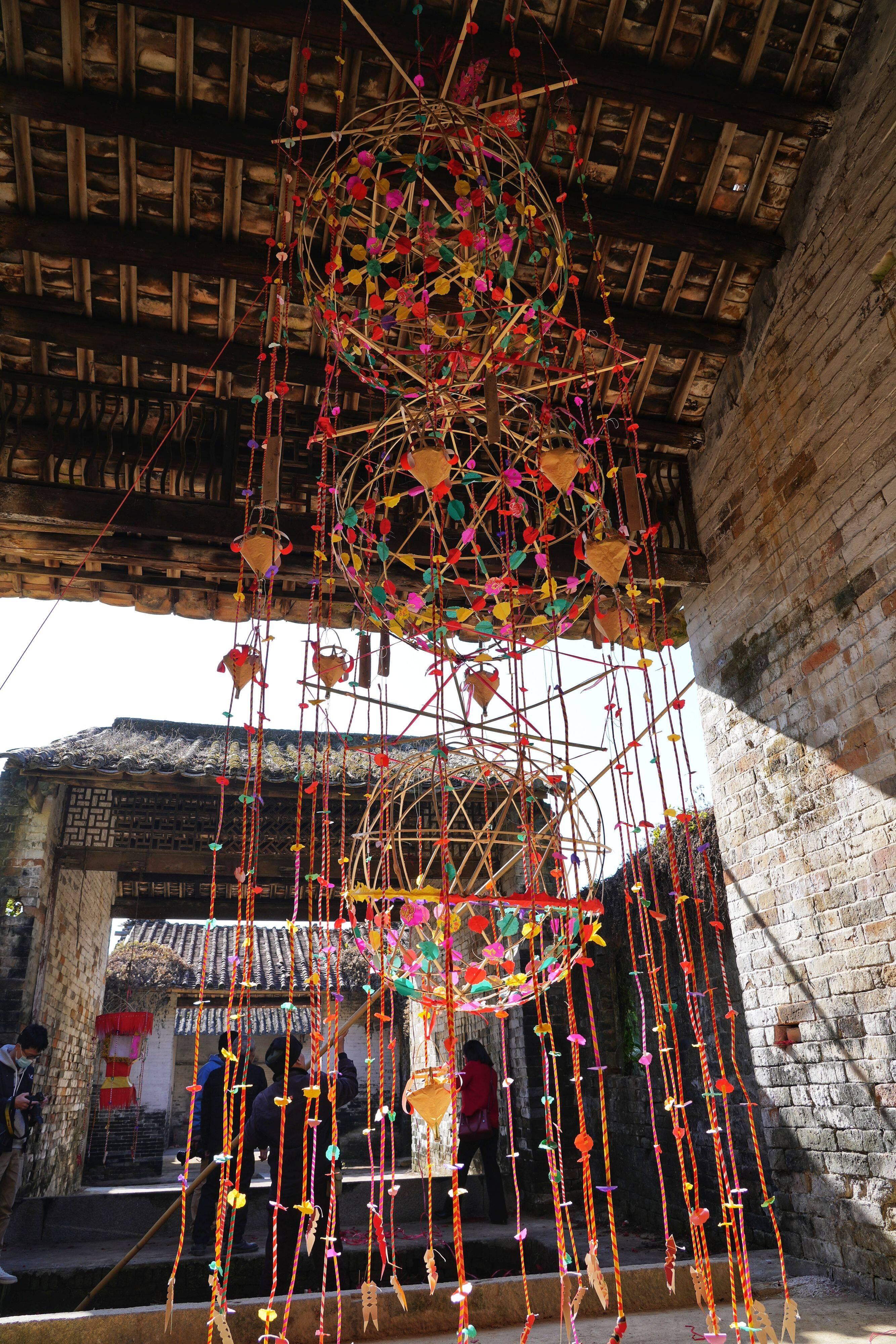1月30日,農(nóng)歷大年初九,記者來到龍門縣永漢鎮(zhèn)鶴湖村虎頭村民小組,看到當(dāng)?shù)氐拇迕駛個忙忙碌碌,有的制作虎頭花燈,有的將虎頭花燈送到朱莊、大圍、松下嚇等各村小組的祠堂掛起來,準(zhǔn)備在今年元宵節(jié)上燈儀式所用的虎頭花燈。