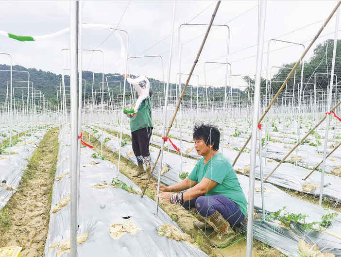 車村村村民正在地里給苦瓜苗牽藤。 惠州日報記者湯渝杭 攝