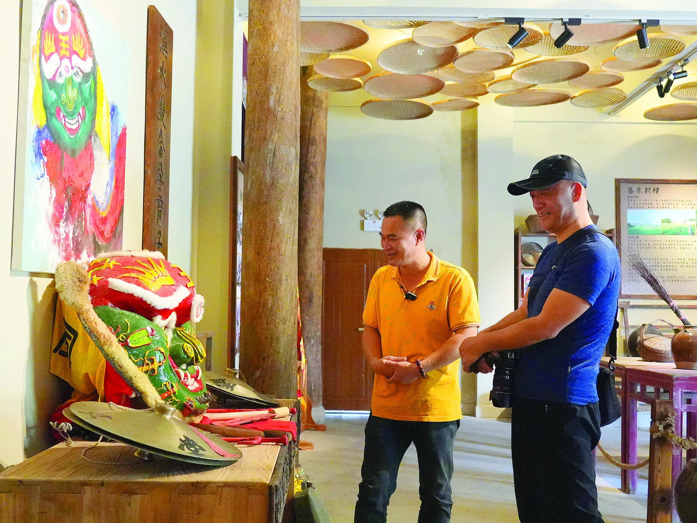 走進溪美村史館,首先映入眼簾的是正中間的蓋子獅彩畫,栩栩如生;旁邊是一副上書“溪水雙合孕育千秋桑梓 美德長存福澤百世子孫”的對聯;下方的展臺擺放著造型獨特的蓋子獅獅頭,格外顯眼。環顧四周,隨處可見農耕老物件,如鋤頭、籮筐、犁耙、石磨、谷風機等農具,以及帶有年代感的桌椅、廚具等藏品近200件。