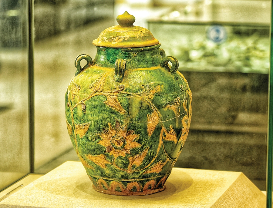 而元代綠釉印塑蓮瓣紋及堆塑珍珠鏈花卉紋蓋罐,明代三彩堆雕纏枝花卉五系帶蓋大罐,前者用來存放逝者骨灰,后者用作收納貴重物品,單從名字,都可以看出其工藝復雜程度,它們與戰國、西漢陶甕一起,被視為“鎮館之寶”。