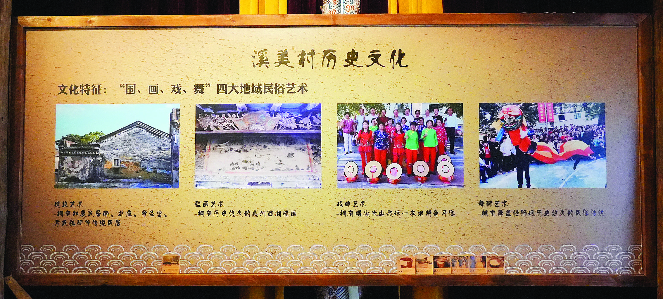 溪美村有400多年歷史,村里至今保留著比較完好的古民居建筑近30座,一座清代古民居還保留有一幅惠州西湖壁畫。