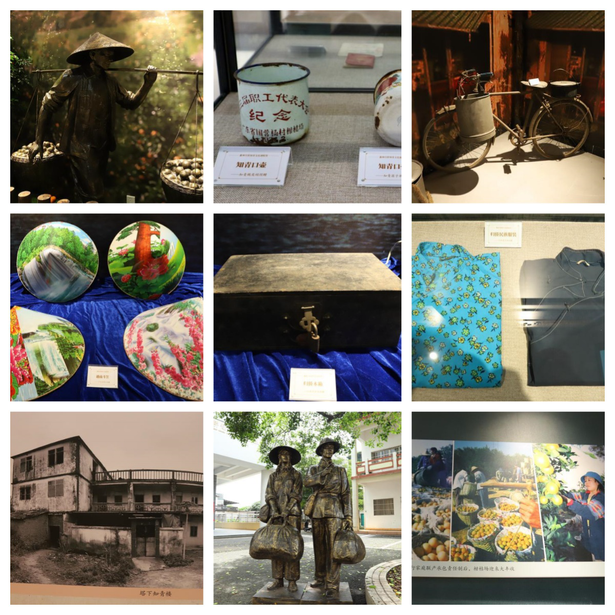 上左:銅像還原當(dāng)年柑橘豐收?qǐng)鼍啊?上中:知青使用過的口壺。 上右:歸僑使用過的自行車。 中左、中中:歸僑使用過的木箱、斗笠。 中右:歸僑服飾。 下左:知青樓舊照。 下中:還原當(dāng)年歸僑知青形象的銅像。 下右:當(dāng)年柑橘豐收?qǐng)鼍啊?/font>