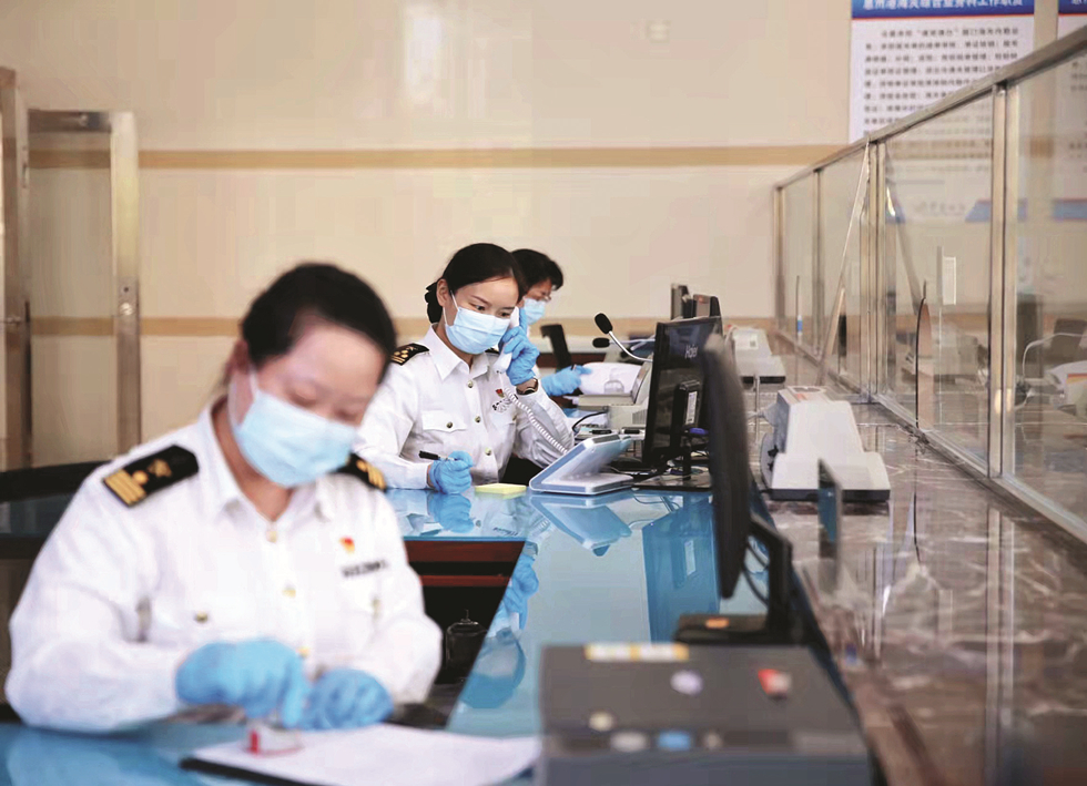 惠州港海關(guān)工作人員在服務(wù)大廳前臺忙碌著。惠州東江圖片社供圖
