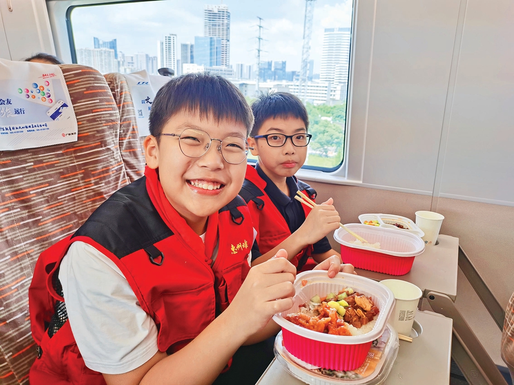 中午11時45分,小記者們乘坐廣汕高鐵返回惠州,在回程中愉快地享用高鐵提供的午餐,香噴噴的飯菜讓小記者們“大快朵頤”。“這是我第一次在高鐵上吃飯,用餐體驗感不錯,菠蘿咕嚕肉拼宮保雞丁飯很好吃。”小記者趙姊涵激動地對記者說,列車運行很平穩,在車上用餐體驗感不錯。