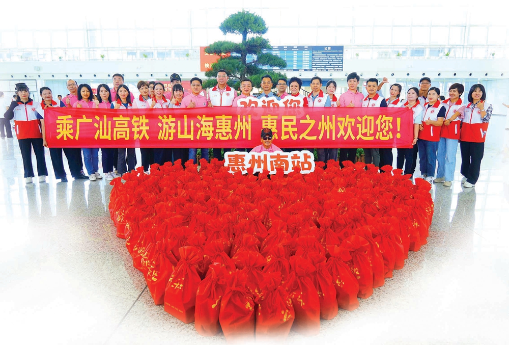 “乘廣汕高鐵,游山水惠州!惠州歡迎您!”游客一出站,志愿者們舉著歡迎標語大聲喊出歡迎口號,并為他們送上裝滿了各種零食的紅色福袋,吉他歌手則在現場演奏,美妙的音樂和熱烈的氣氛,讓不少旅客直呼驚喜。