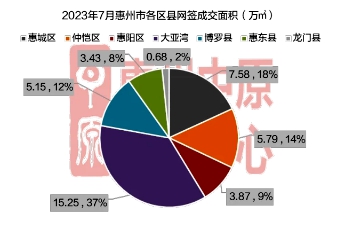 成交方面,7月惠州新房住宅網簽4018套,網簽面積為41.76萬㎡。分區縣來看,大亞灣區成交規模最大,為15.25萬㎡,環比上升110.54%,其次為惠城區。