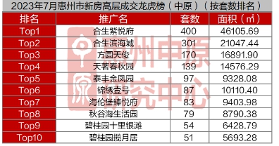 個盤表現方面,合生紫悅府以400套的網簽量摘得7月成交桂冠;合生濱海城及方圓天俊則分別以301套及170套的成績位列第二、第三名。