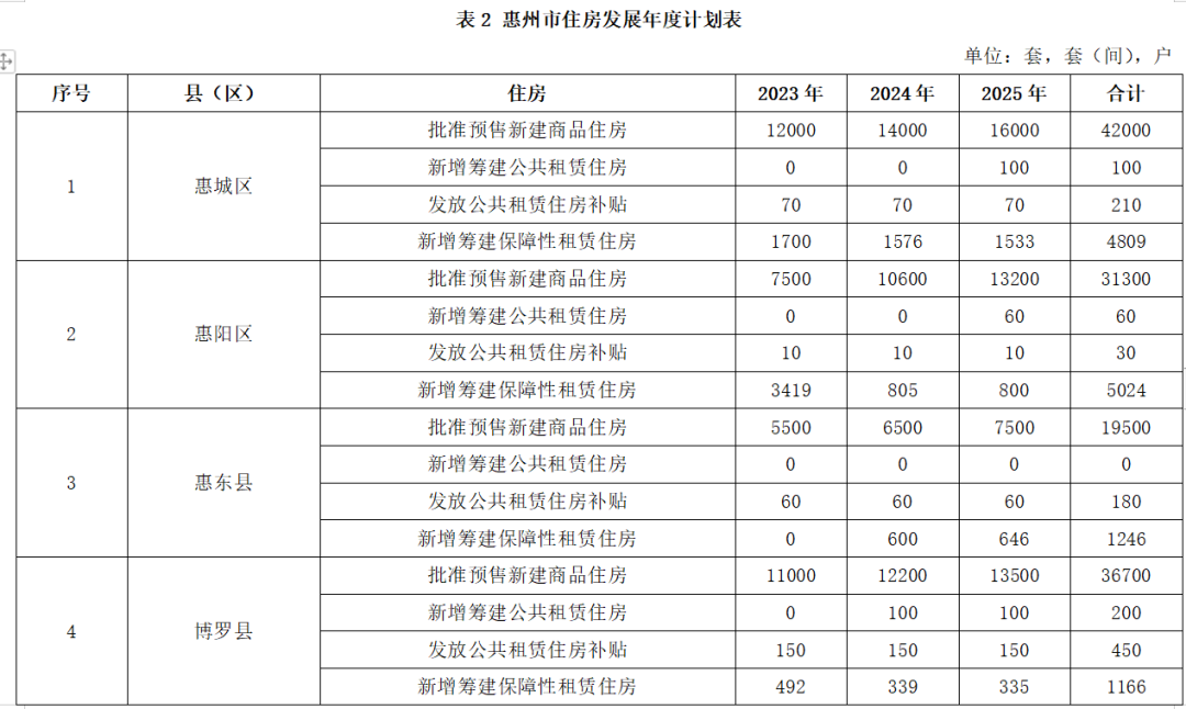 為2023至2025年全市批準(zhǔn)預(yù)售新建商品住房21萬(wàn)套左右,招拍掛供應(yīng)住宅用地265公頃左右;新增籌建公共租賃住房560套,發(fā)放租賃補(bǔ)貼1173戶,新增籌建保障性租賃住房不少于16000套(間),力爭(zhēng)達(dá)到21000套(間);住房公積金新開(kāi)戶職工人數(shù)34.25萬(wàn)人,住房公積金新增繳存額170.86億元;新開(kāi)工住宅綠色建筑面積占比達(dá)到100%,新增城鎮(zhèn)老舊小區(qū)改造300個(gè),為我市打造成為珠江東岸新增長(zhǎng)極、粵港澳大灣區(qū)高質(zhì)量發(fā)展重要地區(qū)和更加幸福國(guó)內(nèi)一流城市提供有力支撐。以上目標(biāo)任務(wù)均與省城鎮(zhèn)住房發(fā)展“十四五”規(guī)劃進(jìn)行了銜接。