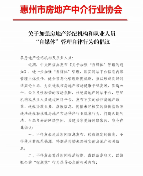 日前,記者從惠州市住房和城鄉(xiāng)建設(shè)局獲悉,在該局指導(dǎo)下,惠州市房地產(chǎn)中介行業(yè)協(xié)會(huì)正式發(fā)布《關(guān)于加強(qiáng)房地產(chǎn)經(jīng)紀(jì)機(jī)構(gòu)和從業(yè)人員“自媒體”管理自律行為的倡議》(以下簡(jiǎn)稱《自律倡議》),倡議共同構(gòu)建天朗氣清、生態(tài)良好的網(wǎng)絡(luò)空間,為惠州房地產(chǎn)市場(chǎng)健康平穩(wěn)發(fā)展?fàn)I造公平、公正良性和諧的市場(chǎng)氛圍。