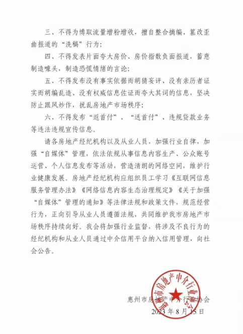對(duì)于個(gè)別中介機(jī)構(gòu)頻繁發(fā)布唱衰樓市信息的情況,該協(xié)會(huì)認(rèn)為中介機(jī)構(gòu)不得發(fā)表片面夸大相關(guān)房?jī)r(jià)負(fù)面報(bào)道細(xì)節(jié)、房?jī)r(jià)指數(shù),蓄意制造噱頭,誤導(dǎo)社會(huì)公眾,制造恐慌情緒的言論。同時(shí)也不應(yīng)發(fā)布沒有事實(shí)依據(jù)而胡猜妄評(píng)、沒有親歷者證實(shí)而胡編亂造、沒有權(quán)威信息佐證而夸大其詞的互聯(lián)網(wǎng)信息,擾亂房地產(chǎn)市場(chǎng)秩序。