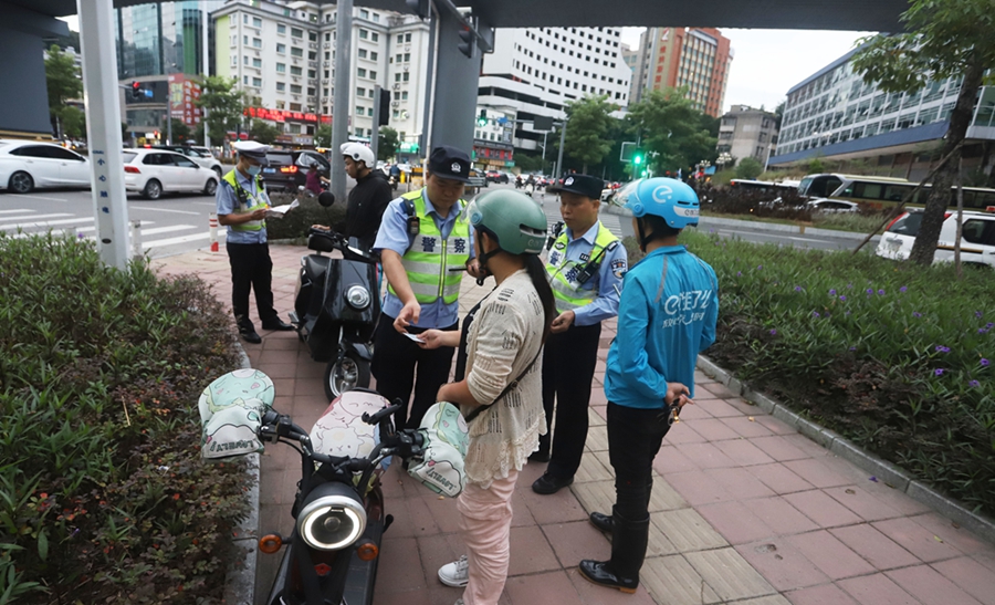 當日下午5時許,記者在市區鵝嶺南路與鵝嶺西路交會路口發現,一些“摩電”駕乘人員還是存在不戴安全頭盔、隨意變道、逆行等交通違法行為。不久,一輛電動自行車沿鵝嶺西路由西往東行駛,駕乘人員因未佩戴安全頭盔被執勤交警攔下進行教育、處罰!邦^盔忘在家里了,下次一定注意!瘪{駛員王先生認為,駕駛摩托車、電動自行車不戴安全頭盔,確實有一定的危險性。