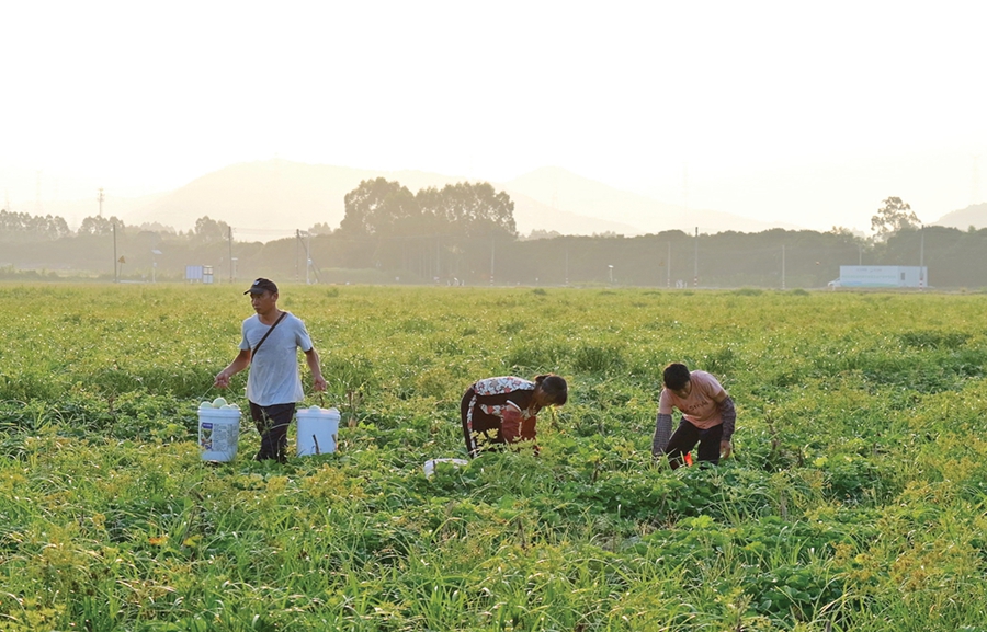 中午11時許,采收工作已經持續了5個多小時,看著基地轉運場堆如小山的白香瓜,李院樂擼起衣角,擦了擦滿臉的大汗,坐在三輪車上和記者聊起了往事。“我是2006年從部隊退役的,退役后去珠海的商超做過一段時間生鮮果蔬的供應鏈經理,積累了一些工作經驗后,2015年自己出來創業,做生鮮果蔬的供應鏈管理和相關的電商發貨。”李院樂說,隨著鄉村振興戰略的實施,這些年農村變化很大,農村的經營模式轉變也很大,以前是憑借自己的經驗種,然后等中間商上門收購,質量價格都難有保障。現在隨著“百千萬工程”的實施,很多農村開始抱團發展,不少村都有了自己的合作社,也開始有了建立農產品品牌的意識。