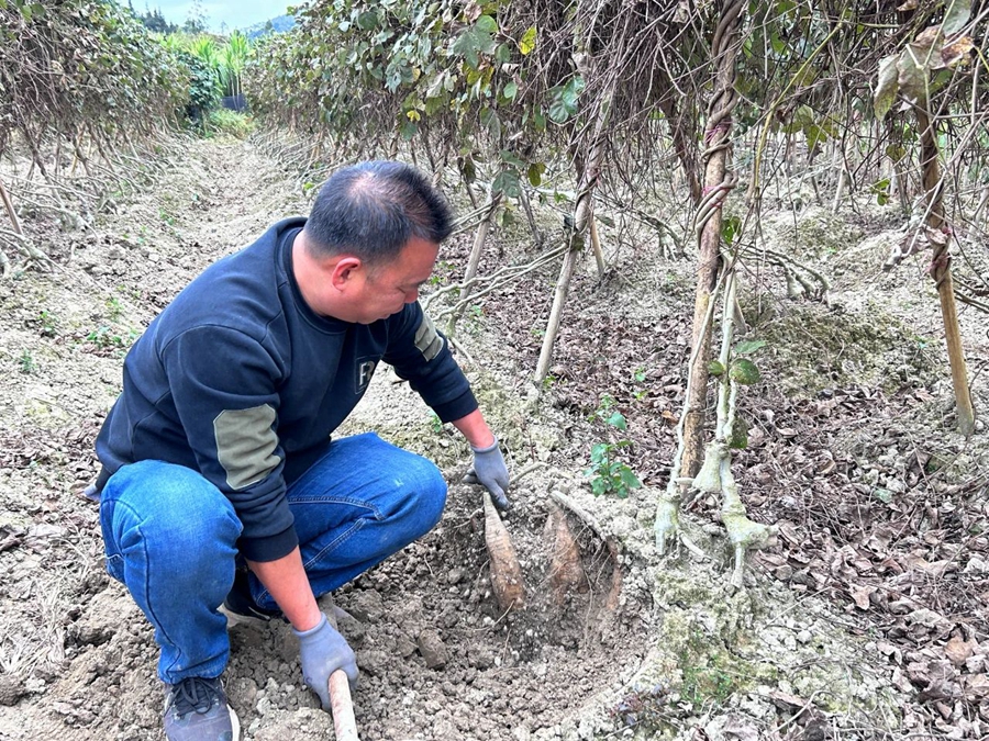 “一般情況下,每年3月份,農戶們就開始種植粉葛,當年11月底便可陸續采收。”當地粉葛種植大戶廖衛光說,今年,他種有粉葛30多畝,畝產大概1000公斤。目前,粉葛市場行情較好,市場價每公斤約12元至16元。記者在廖衛光家的粉葛種植地看到,成片的粉葛樹雖被霜打得葉子枯黃,但地下的粉葛大多飽滿粗壯。廖衛光熟練地用鋤頭順著粉葛根莖的方向挖下去,一根粗壯結實的粉葛就從泥土中露了出來。