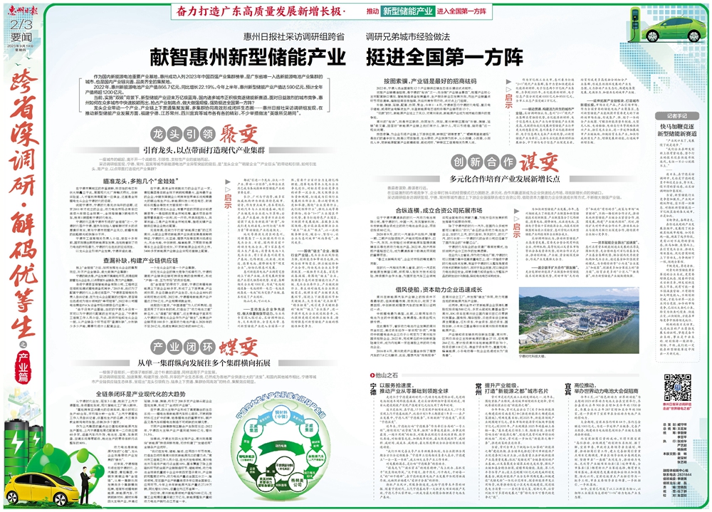 博觀而約取,厚積而薄發。日前,在市委宣傳部的統籌指導下,惠州日報社全媒體采訪調研組深入“世界鋰電之都”福建寧德,實地采訪調研寧德新型儲能產業發展的最新成效,同時結合江蘇常州、四川宜賓等城市經驗做法,借助“外腦”取真經,探討新型儲能產業新發展新趨勢,積極貢獻媒體智慧和力量,助力惠州新型儲能產業高質量發展。