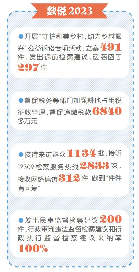 法律監督更加精準。2023年,惠州檢察機關受理民事檢察監督案件609件,提請抗訴6件、發出再審檢察建議53件、提出抗訴2件,發出檢察建議200件,行政審判違法監督檢察建議和行政執行監督檢察建議采納率100%,促進訴源治理。開展市場監管領域行政非訴執行監督專項活動,發出檢察建議69份,促進市場監管領域依法行政。加強對法院應受理而不受理、執行措施不到位等情形的監督,受理非訴執行監督案件172件。圍繞財產保全領域違法情形和礦產資源管理開展專項監督,市檢察院辦理的張某鋒案涉訴前保全問題監督案、督促履行礦產資源管理職責行政公益訴訟案入選全國典型案例。