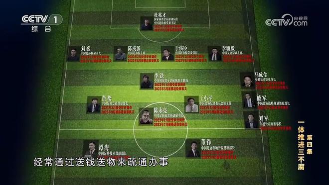 此前,央視播出的反腐專題片《持續發力縱深推進》第四集重點提及了足球領域的腐敗問題,甚至還為涉及貪腐的足壇人員排出了一套11人陣容和3個替補。
