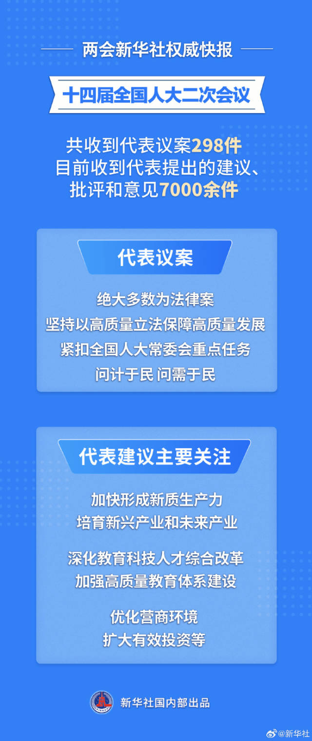 根據大會主席團決定的代表提出議案的截止時間,到3月8日12時,十四屆全國人大二次會議秘書處共收到代表提出的議案298件。此外,目前大會秘書處收到代表提出的建議、批評和意見7000余件。