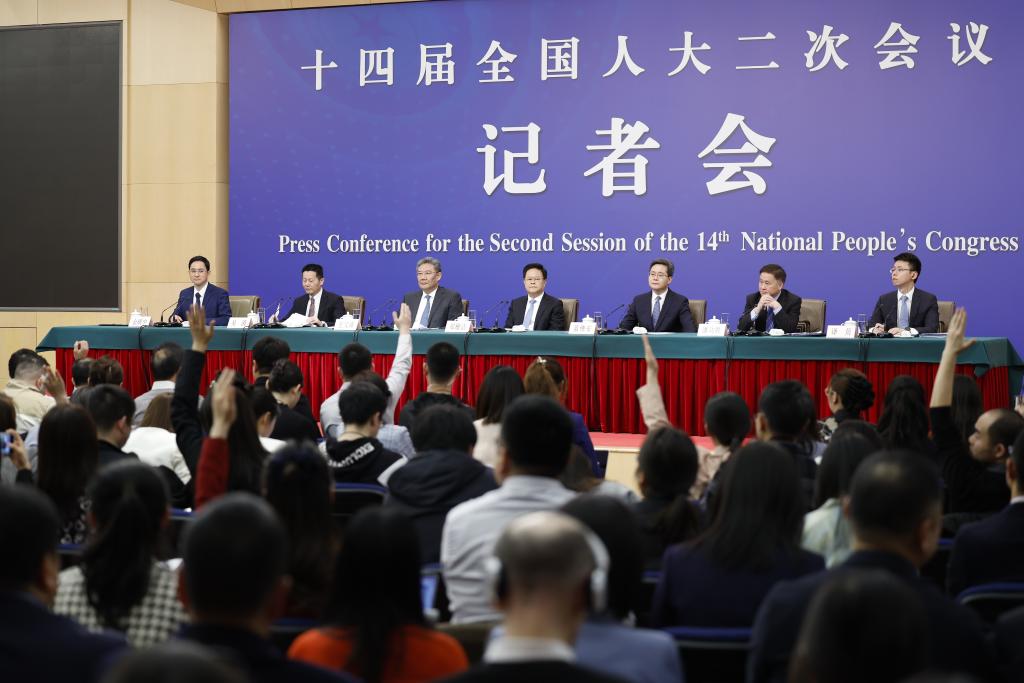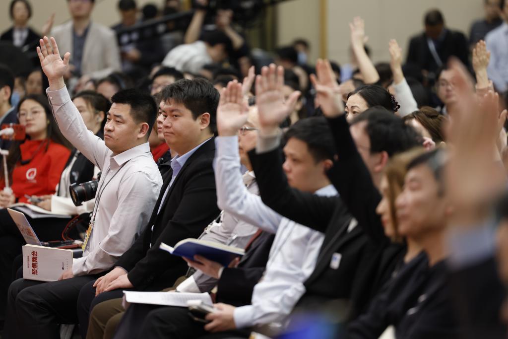 3月6日,十四屆全國(guó)人大二次會(huì)議在北京梅地亞中心新聞發(fā)布廳舉行記者會(huì)。國(guó)家發(fā)展和改革委員會(huì)主任鄭柵潔、財(cái)政部部長(zhǎng)藍(lán)佛安、商務(wù)部部長(zhǎng)王文濤、中國(guó)人民銀行行長(zhǎng)潘功勝、中國(guó)證券監(jiān)督管理委員會(huì)主席吳清就發(fā)展改革、財(cái)政預(yù)算、商務(wù)、金融證券等相關(guān)問(wèn)題回答中外記者提問(wèn)。這是記者舉手提問(wèn)。