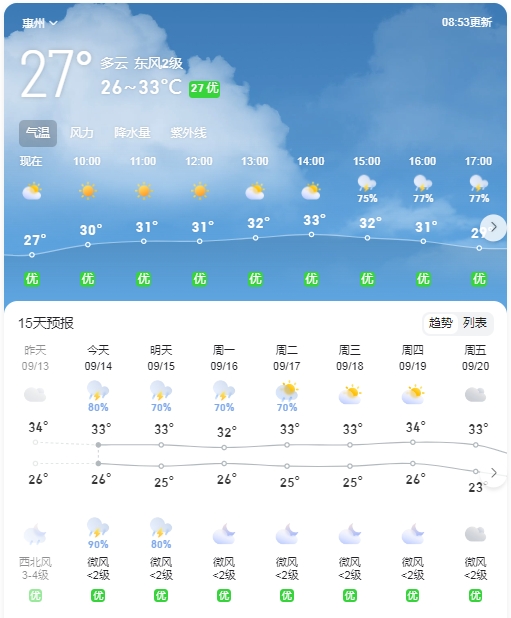 據惠州市氣象臺預計,中秋假期(15-17日)我市天氣陽光與雷雨相伴,間中雨勢較大;中秋夜部分時段可見月光。