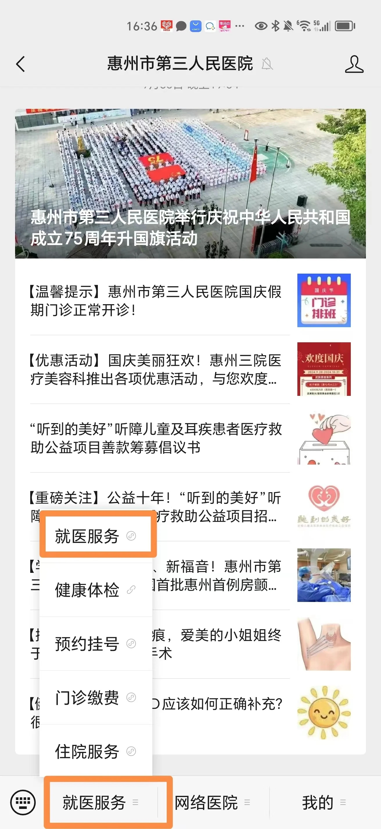 關(guān)注“惠州市第三人民醫(yī)院”公眾號(hào),綁卡成功后(在服務(wù)號(hào)主頁(yè),就醫(yī)服務(wù)—選擇添加就診卡—輸入個(gè)人信息—完善就診人資料),在首頁(yè)—就醫(yī)服務(wù)—預(yù)約掛號(hào)—選擇(總院區(qū))—選擇科室(志愿服務(wù)-長(zhǎng)者志愿陪診),即可預(yù)約。