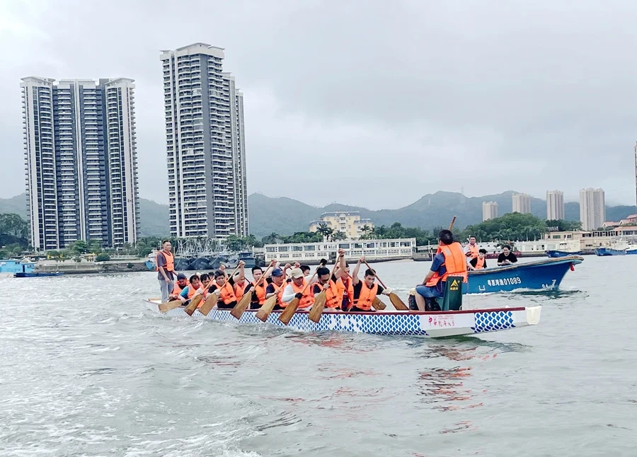 連日來,每到下午3點,金門塘碼頭人頭攢動。參加龍舟賽的隊員們在岸邊做好熱身運動,身著整齊的服裝登上龍舟,各就各位。“咚咚咚……”訓練現場,鼓聲鏗鏘,吆喝聲激昂,劃手們跟隨著鼓點用力奮楫,一艘艘龍舟如離弦之箭在清澈的水面上劈波斬浪,海面上濺起一陣陣雪白的浪花,成為夏日大亞灣畔的一道靚麗風景。