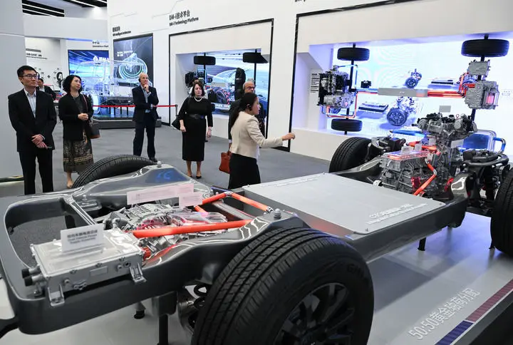 外賓在位于深圳市坪山區的比亞迪全球總部展廳參觀(2024年7月22日攝)。新華社記者 李賀 攝