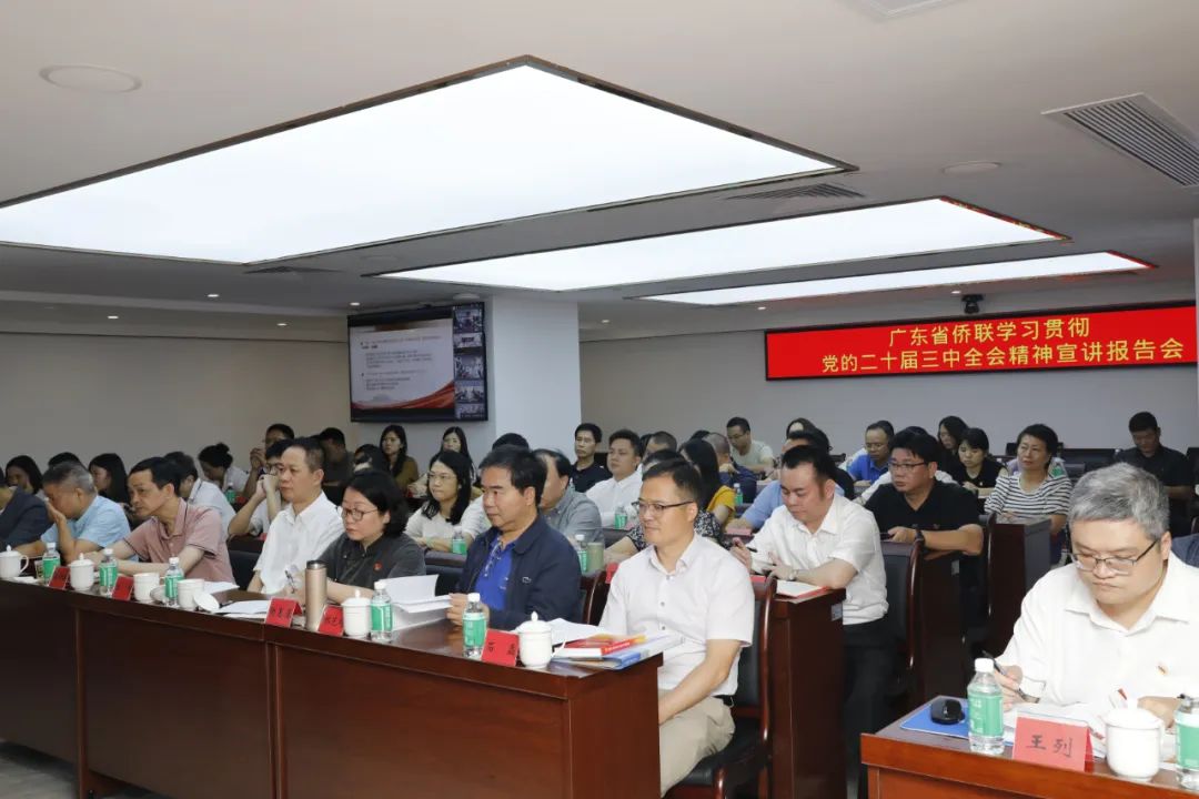 8月13日上午,廣東省僑聯邀請省委宣講團成員、省社會科學院黨組書記郭躍文作學習貫徹黨的二十屆三中全會精神專題宣講報告,省僑聯黨組書記、主席李豐主持會議并講話。省僑聯機關和下屬事業單位全體干部職工,省僑聯業務主管社會組織全體黨員以及僑界代表參加會議。各地級以上市僑聯全體干部職工,以及當地僑聯委員和歸僑僑眷代表以視頻會議形式同步收聽收看。