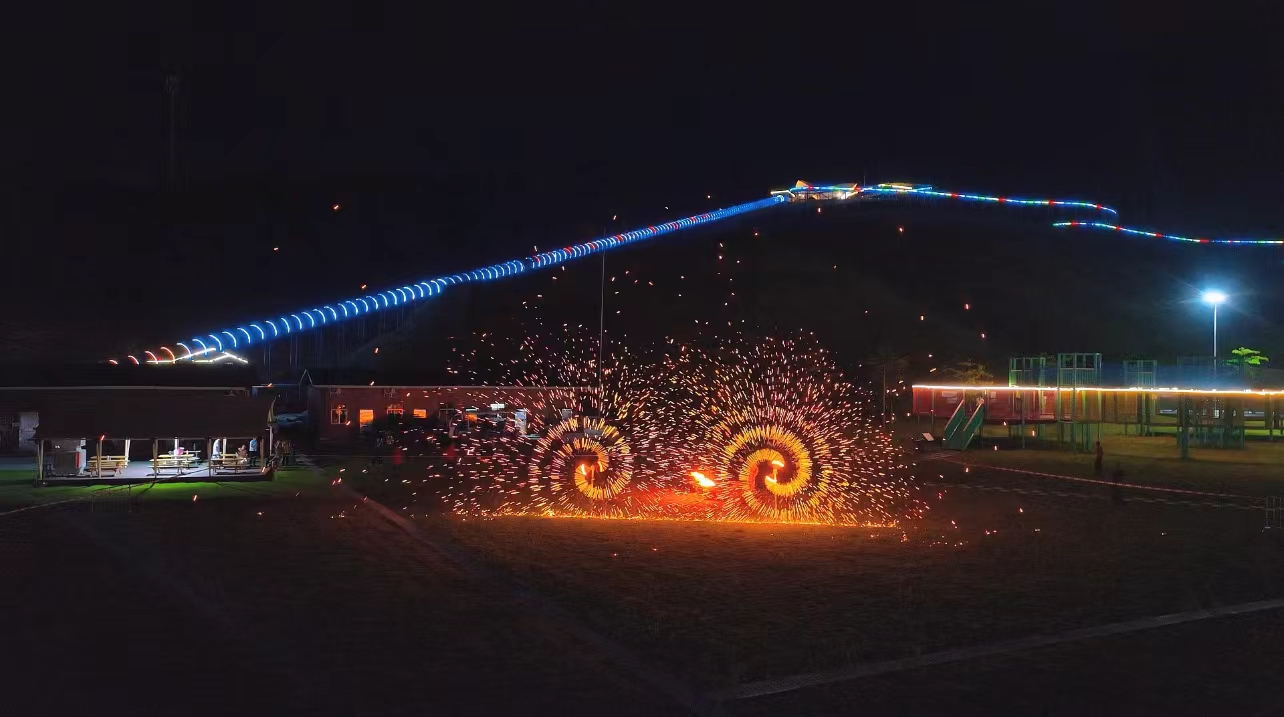 除了現代光影藝術的展現,鹿鷹園還深度挖掘并呈現了中華文化的瑰寶。國家非物質文化遺產項目“打鐵花”與龍門藍田瑤族鄉的省級非遺“舞火狗”相繼登場,尤其是圍繞篝火展開的舞火狗活動,不僅展示了傳統文化的獨特魅力,更激發了游客的參與熱情,大家手拉手,圍繞篝火共舞,享受這份來自傳統文化的狂歡。舞火狗第六批非遺傳承人羅楚燕說:“我們希望通過這樣的平臺,讓更多人了解舞火狗的歷史和文化內涵。未來,我們計劃與鹿鷹園長期合作,定期在周末或節假日安排演出,讓非遺文化活起來、傳下去。”