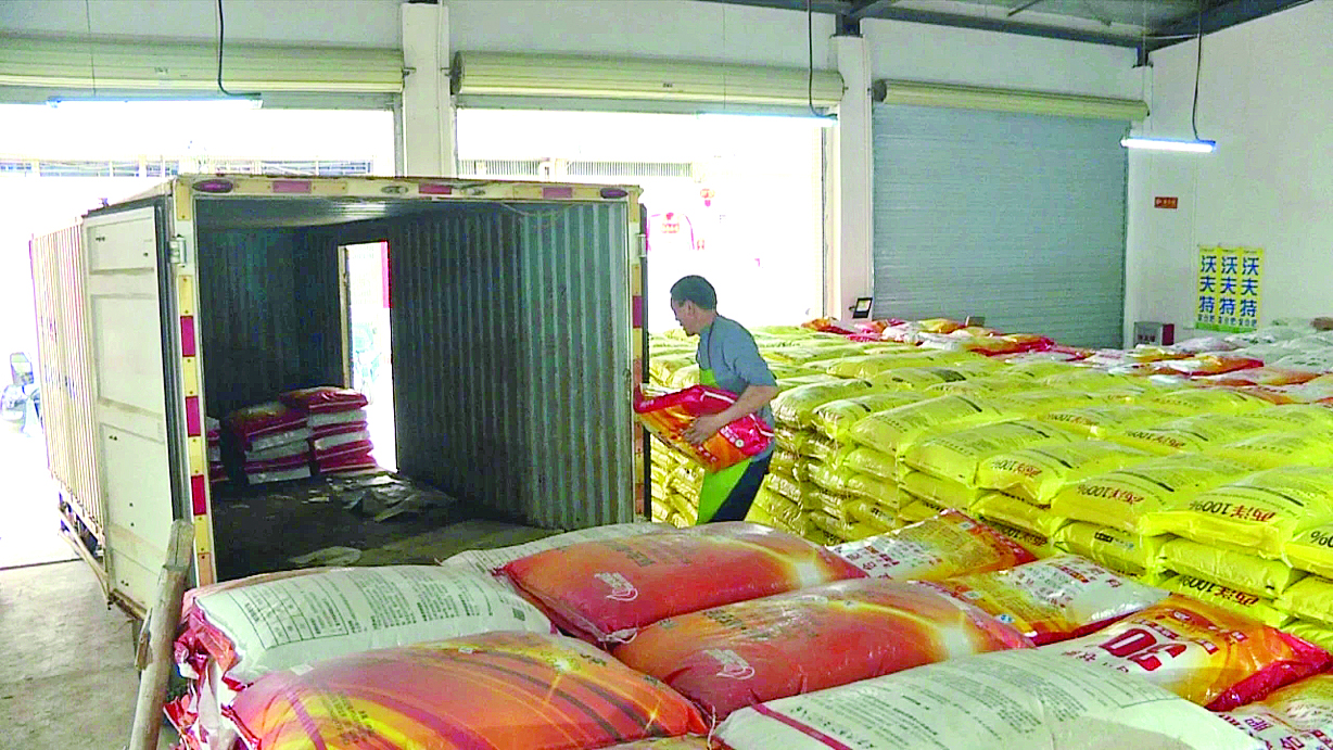 農(nóng)資網(wǎng)點(diǎn)工人正在運(yùn)送農(nóng)資。惠州日?qǐng)?bào)記者蔡偉健 攝