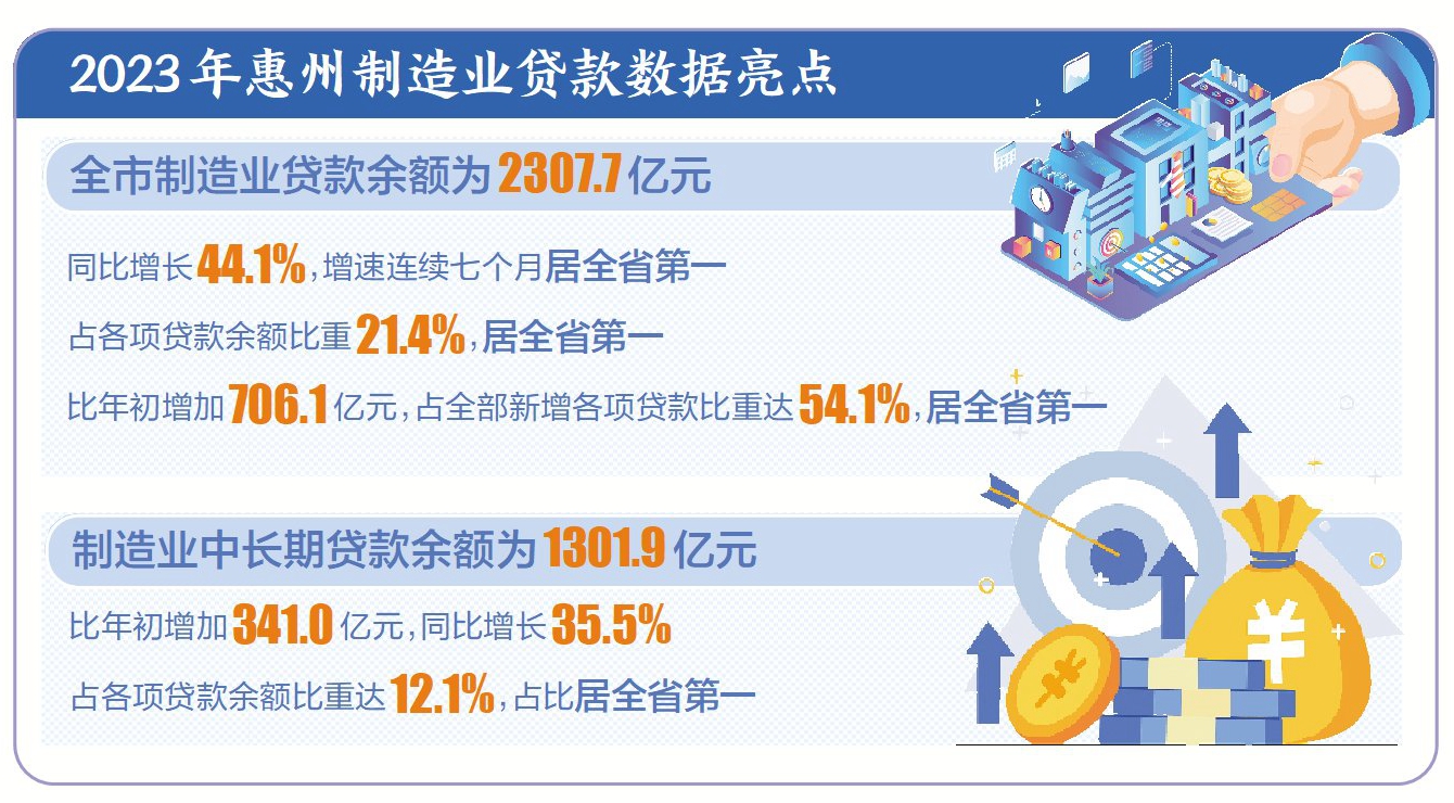 過去一年,惠州堅持“制造業(yè)當家”。在金融支持制造業(yè)方面,惠州制造業(yè)貸款4項指標排名保持全省第一。截至2023年末,全市制造業(yè)貸款余額2307.7億元,同比增長44.1%,增速連續(xù)七個月居全省第一。