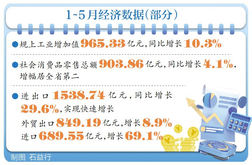 外貿方面,今年1~5月,我市進出口1538.74億元,同比增長29.6%,實現快速增長。其中,外貿出口849.19億元,增長8.9%;進口689.55億元,增長69.1%。金融則實現了穩(wěn)健運行,5月末,金融機構本外幣存款余額9634.66億元,增長3.0%;金融機構本外幣貸款余額10977.53億元,增長7.2%。
