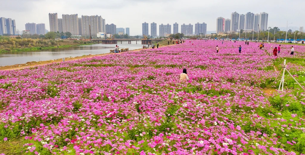 惠城區小金河大道路邊上有30畝格桑花盛開,吸引了許多游客觀賞打卡。