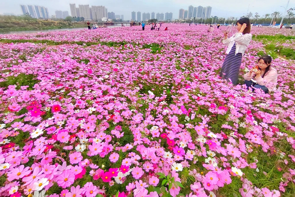 惠城區小金河大道路邊上有30畝格桑花盛開,吸引了許多游客觀賞打卡。