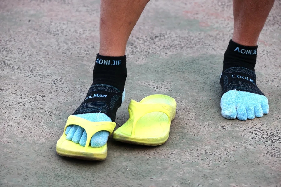 “一開始跑馬拉松我也是穿運動鞋,全程跑下來腳趾擠得很痛,于是在跑友的推薦下開始穿人字拖跑。”訓練結束后,馮建軍向記者展示他的拖鞋——一雙專門為跑步設計的運動氣墊人字拖,整個鞋身為橡膠一體制作,鞋后跟里有氣墊,可以起到減震作用。從2021年到現在,他都是穿這類人字拖跑步。