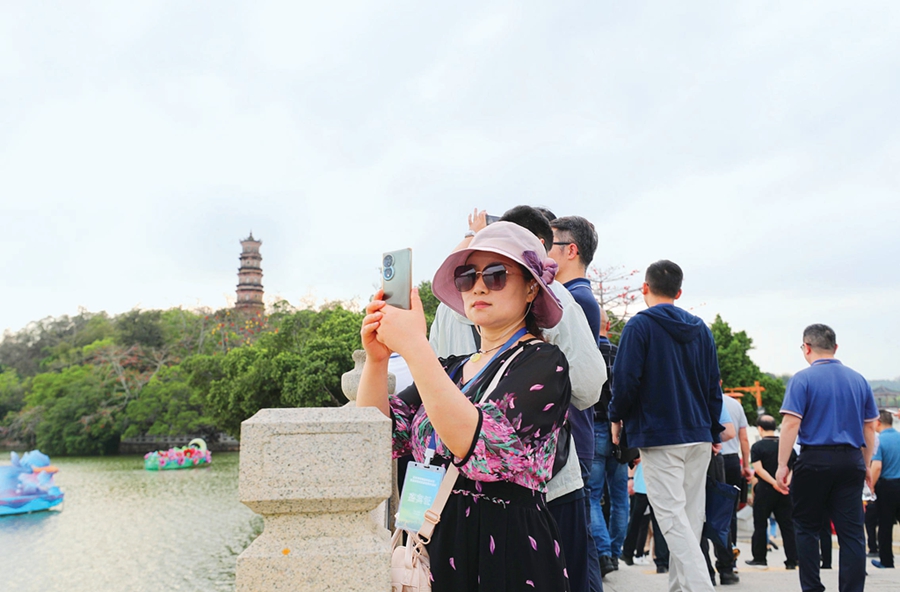 三月春和景明,西湖花開,湖光瀲滟,遠處青山似黛,古色古香的亭臺樓閣隱現于樹木蔥蘢之中。從東坡祠出來,學員們走進惠州西湖景區,飽覽西湖美景。