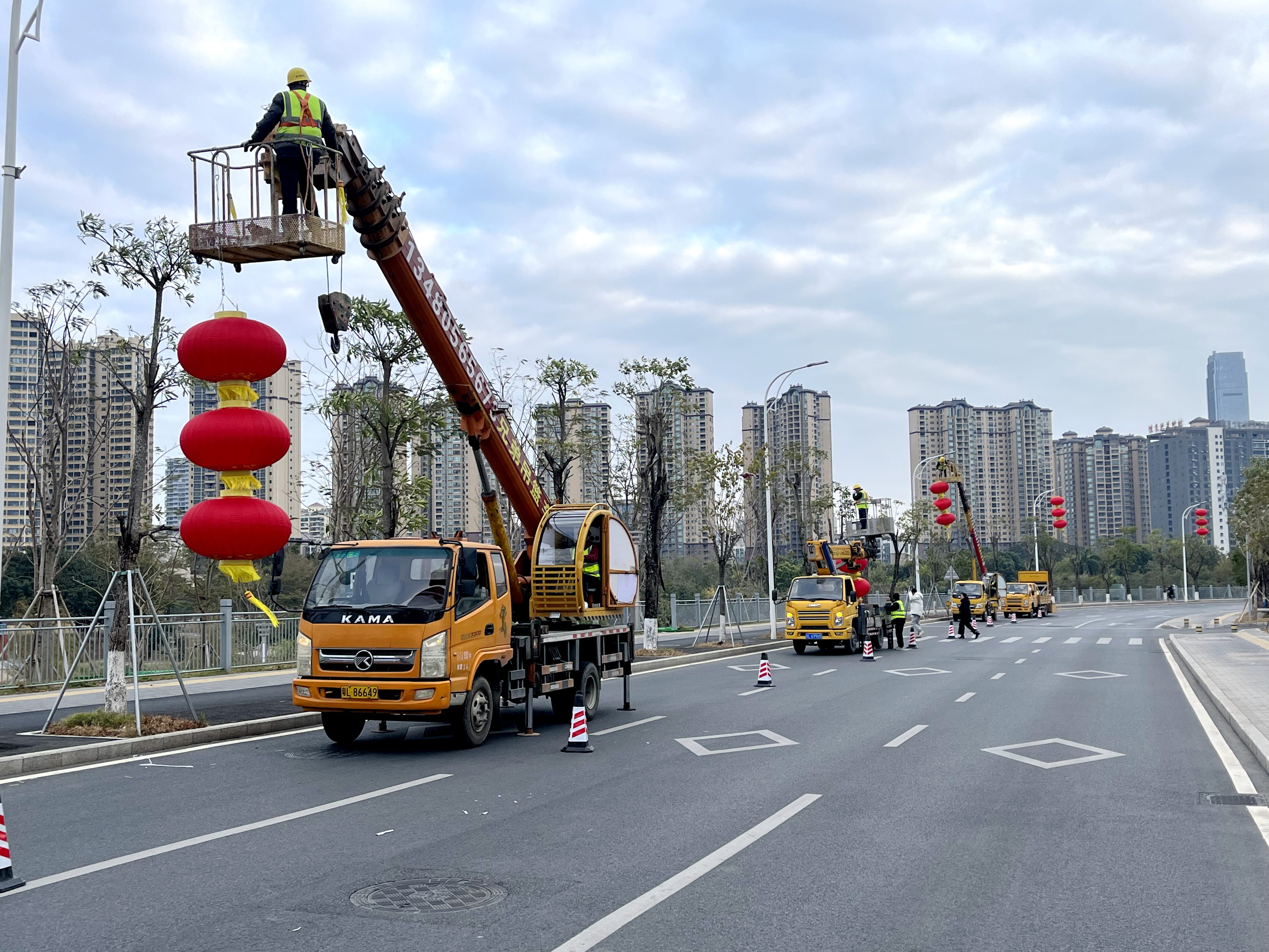 日前,記者在靠近惠陽濱水公園的半島路上看到,工人們在作業車上抓緊將紅燈籠掛上樹。微風吹拂下,一串串鮮艷的紅燈籠隨風搖擺,五顏六色的時花爭奇斗艷,喜氣洋洋,格外吸引眼球,引得不少路過的市民紛紛打卡拍照。“年味越來越濃了。”途經的市民劉許玥望著紅燈籠說。
