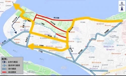 (二)濱江東路/黃家塘街交叉口至濱江東路/東江沙路交叉口路段,調(diào)整為車輛東往西單向通行。