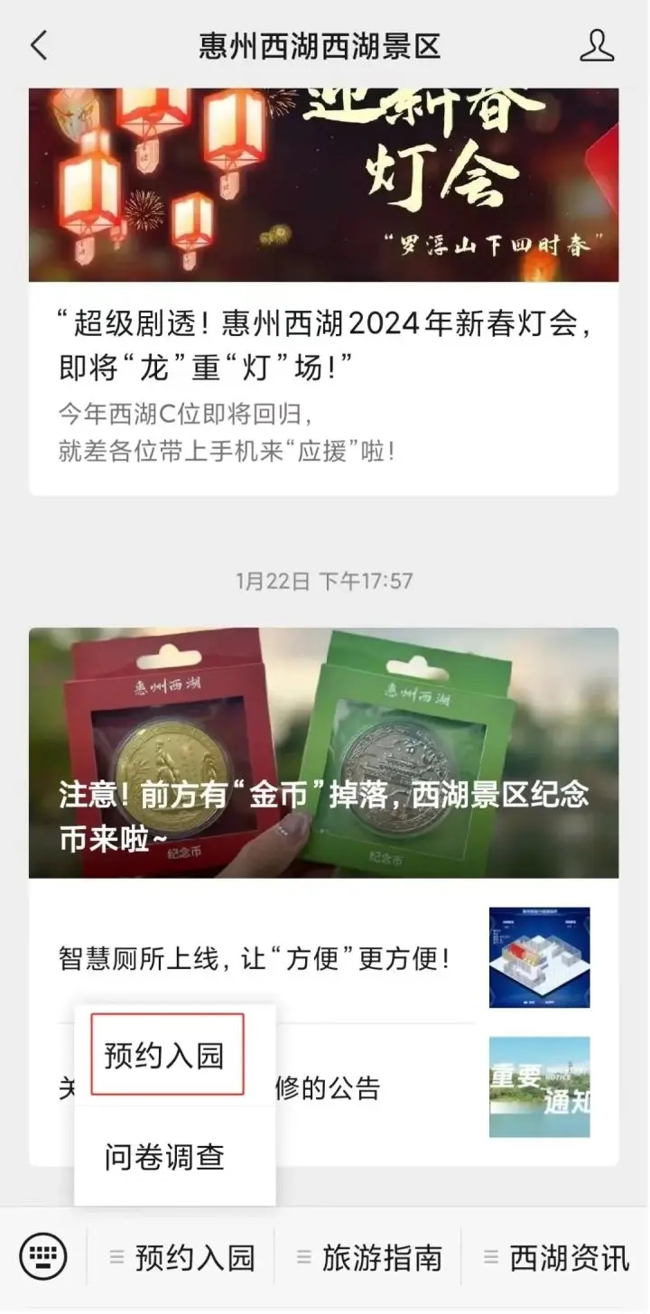 (一)通過“ 惠州西湖西湖景區 ”公眾號或“惠州西湖景區”小程序進入預約界面。