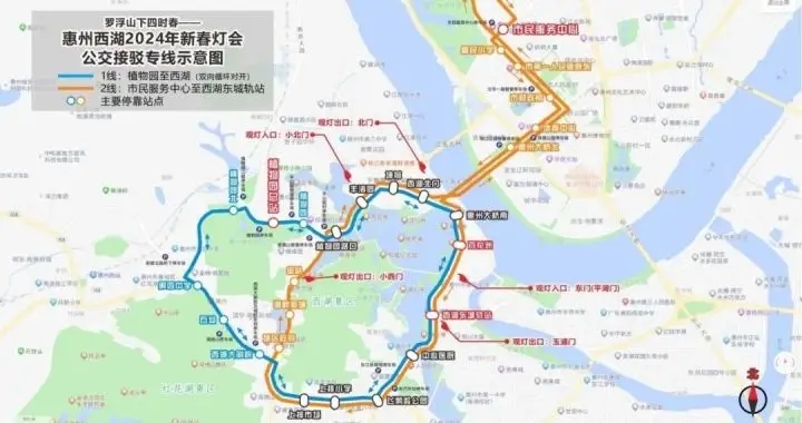 西湖新春燈會高峰期間(每日17:30至23:00),公安交警部門分別在市區江北片區市民服務中心和江南片區惠州植物園設置公交車接駁點,環西湖周邊道路除西湖東門(平湖門)、豐湖書院(麗日)公交站外,依托其他公交站設置上落客點,建議游園觀燈游客可將車輛停放在公交接駁點、上落客點周邊的停車場,換乘免費接駁公交車輛往返,接駁公交車發車間隔約10分鐘/班。停車場對應乘坐接駁線公交站點如下: